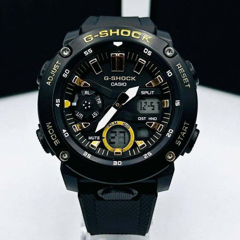 Modelo: GA 2000 Analógico: sim Digital: sim Tamanho da caixa: 50mm Peso: 67 gramas Cor da caixa: preto Cor da pulseira: preto Cor do fundo: preto e dourado Funcionamento: 100% Movimento maquinário: bateria Qualidade Maquinário: chinês Catraca: fixa Material da caixa: emborrachado Material da pulseira: emborracha A prova d'água? sim Garantia: sim de 2 meses no maquinário leia regras abaixo e no rodapé do site. Ver descrição completa