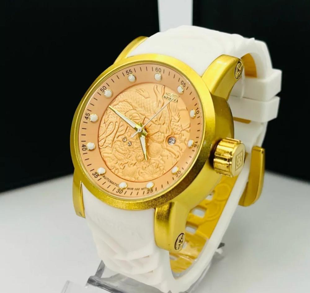 FICHA TÉCNICA RELÓGIO PRIMEIRA LINHA: Modelo: Yakusa S1 Analógico: sim Digital: não Tamanho da caixa: 50mm Peso: 120 gramas Cor da caixa: dourada Cor da pulseira: branca Cor do fundo: dourado Funcionamento: hora e data Movimento maquinário: bateria Qualidade Maquinário: chinês Catraca: fixa Material da caixa: metal Material da pulseira: borracha A prova d'água? sim Ver descrição completa