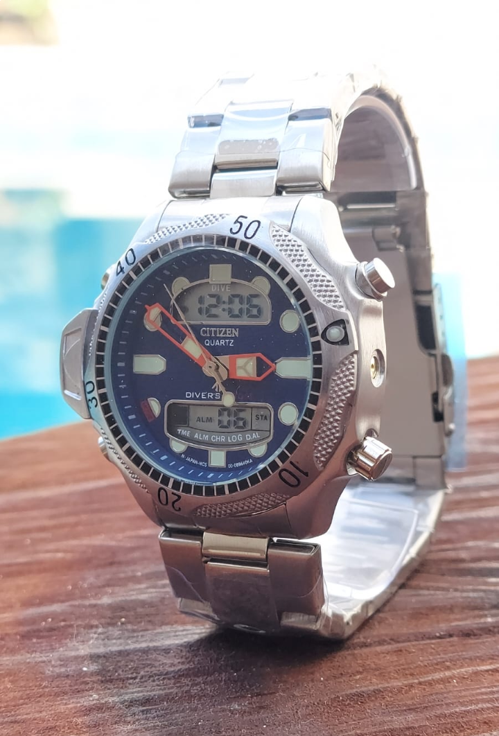 O Citizen Promaster Aqualand C500 tem um visual moderno com um toque retrô, vintage, que remete aos anos 1980. Um relógio Citizen é uma fusão elegante de design contemporâneo e precisão japonesa. Os relógios Citizen oferecem estilo sofisticado, durabilidade e funcionalidades avançadas, tornando-os uma escolha confiável para quem busca elegância e desempenho. - Marca: Citizen- Modelo C 500 com Digital - Gênero: Masculino - Material da caixa: Aço Inoxidável- Vidro em Cristal mineral resistente a arranhões-Ponteiros e marcações Luminescentes - Material da pulseira: Aço Inoxidável - Cor da caixa: Prata - Cor da pulseira: borracha - Cor do visor: Vermelho - Catraca giratória: Possui - Mecanismo: Quartzo - Pulseira: Ajustável - Fecho Glidelock com trava de Segurança - Banho: Sim - Lavar carro: Sim - Lavar mãos: Sim - Chuva: Sim - Calendário: Possui - Alarme: sim - Tamanho máquina: Diâmetro: 41mm e Espessura: 12mm - Tamanho pulseira: Comprimento: 230mm e Largura: 24mm - Peso: 190g FOTOS REAIS DO PRODUTO Ver descrição completa
