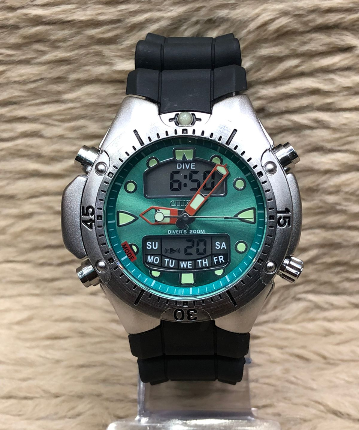 Marca e Modelo: Aqualand Analógico: sim Digital: sim Tamanho da caixa: 50mm Peso: 95 gramas Cor da caixa: dourada Cor da pulseira: preta Cor do fundo: preto Funcionamento: 100% Movimento maquinário: bateria Qualidade Maquinário: chinês Catraca: giratória Material da caixa: metal Material da pulseira: borracha A prova d'água? sim Garantia: sim de 2 meses no maquinário leia regras abaixo e no rodapé do site. Ver descrição completa