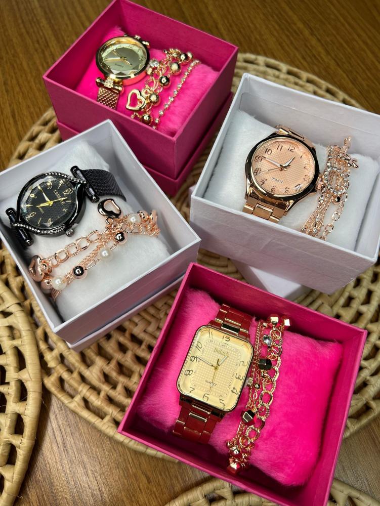 Os modelos enviados são os mais vendidos e as cores vão sortidas de acordo com nosso estoque. Acompanha em cada kit 1 relógio feminino + 1 pulseira + 1 Caixa Ver descrição completa