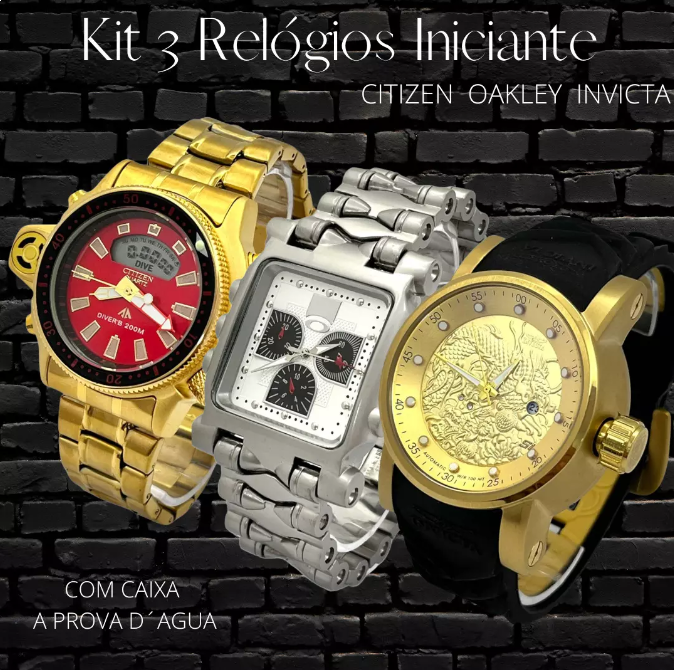 Página inicial Kits Iniciantes Kit Iniciante 3 Relógios DESCRIÇÃO O Kit contem 3 relogios 3 relogios sendo eles : 1 Citizen 1 Oakley 1 Invicta 3 Caixinhas os 3 Relógios a prova dagua Atenção jamais use os relógios em banhos quente ou mornos, jamais jogue agua quente, ou entre em saunas com os relógios, pois pode vir a suar e assim danificando a vedação do relógio. vc pode mandar as cores na observação, ou selecionamos variado conforme estoque Ver descrição completa