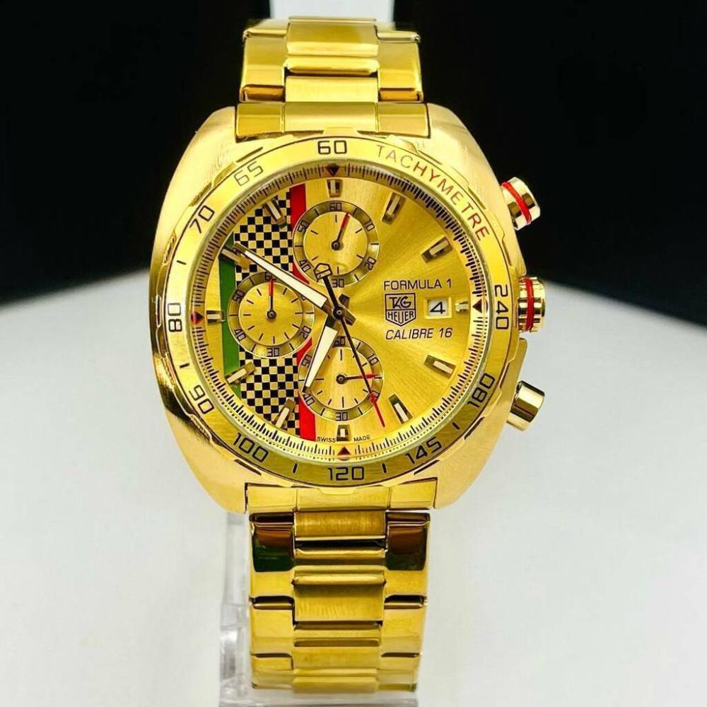 Modelo: 100% Funcional Fórmula 1 Analógico: sim Digital: não Tamanho da caixa: 45mm Peso: 159 gramas Cor da caixa: dourada Cor da pulseira: dourada Cor do fundo: dourado Funcionamento: 100%, ponteiros dos segundos, cronógrafo, data e hora Movimento maquinário: bateria Qualidade Maquinário: chinês Catraca: fixa Material da caixa: metal Material da pulseira: aço Ver descrição completa